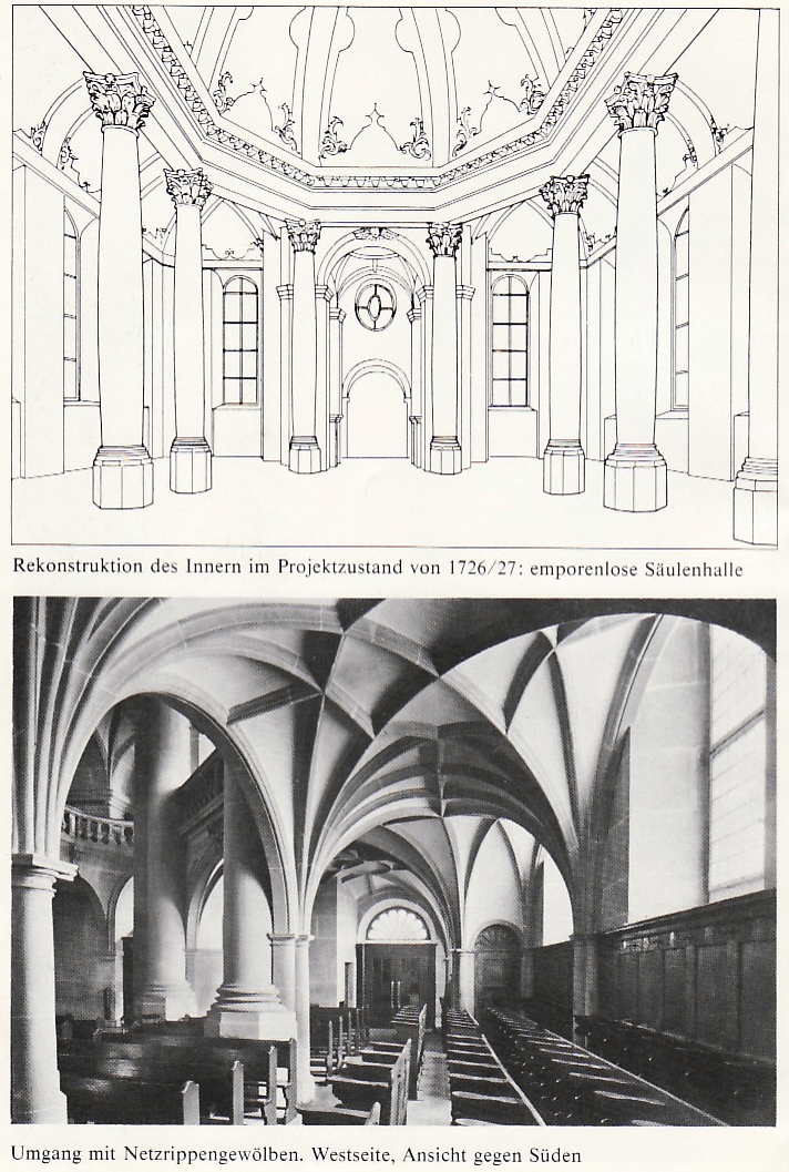 Doch kennt man den Plan jener Kirche (vgl. die Abbildung). Es war dies eine nach dem Azimut des Nordrands der Spitalgasse ausgerichtete Anlage, mit einem schlanken Glockenturm einer Halle und verschiedenen Anbauten, mit einer Einfriedung versehen. In katholischer Zeit war die Kirche Teil eines Klosters.