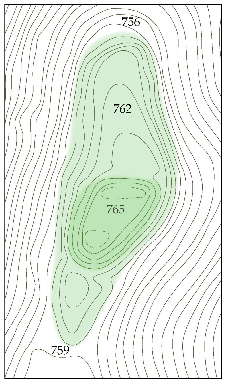 Das Plateau fällt nach allen Seiten steil ab. - Gegen einen kleinen Geländeabsatz im Norden wie gegen den Hals im Süden bei Punkt 759 beträgt die Steilkante drei Meter.