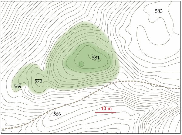 Die zweite Stufe mit der Kote 573 hat gegen den Burghügel hin eine halsförmige Verengung.