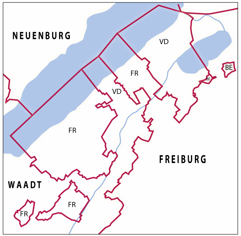 Und überhaupt: Auch die feststehenden Kantonsgrenzen zum Waadtland, besonders im Gebiet der Broye, waren unmöglich kompliziert gezogen: Am Neuenburger See kommt zuerst das waadtländische Cudrefin, dann das freiburgische Portalban, hierauf Chevroux im Waadtland und dann Estavayer-le-Lac (Stäffis am See) in Freiburg. Der letztere Ort ist eine große Enklave in waadtländischem Gebiet.