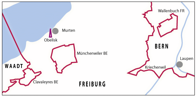 Anmerkung: Im SW von Murten ist ein Obelisk eingetragen. Dieser wurde vom neuen Kanton Freiburg um 1820 aufgerichtet. Vordergründig sollte er an die legendäre Murtenschlacht erinnern. - Die hintergründige Absicht aber war, den Anspruch Freiburgs auf bisher bernisches Gebiet zu begründen.