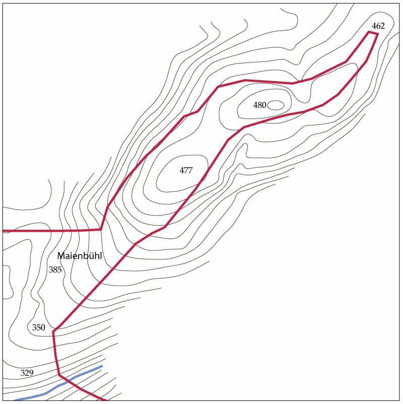 Auf den bewaldeten Höhen im Nordosten des genannten Ortes erstreckt sich ein schmaler, bewaldeter Gebietszipfel vom Hof Maienbühl, genannt die Eiserne Hand in deutsches Gebiet hinein (vgl. die Grafik). Wie soll man einen Korridor von 1,6 Kilometer Länge erklären, der maximal 250 Meter, an seinem äussersten Ende nur mehr ein paar Dutzend Meter breit ist?