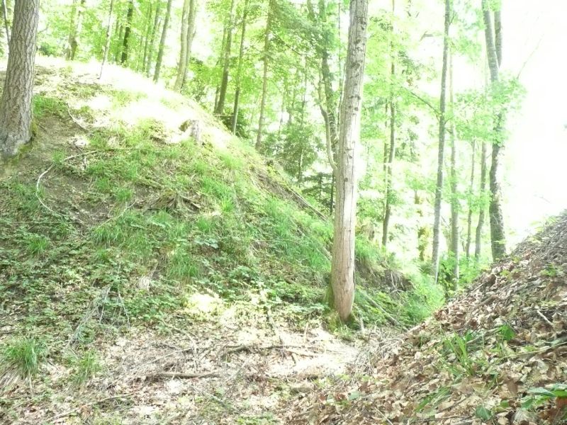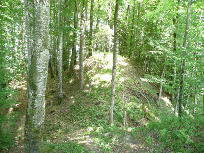 Die erwähnte Geländenase fällt gegen Südwesten acht Meter tief in einen Halsgraben ab, der das Burgplateau von dem langsam ansteigenden Bergrücken trennt.