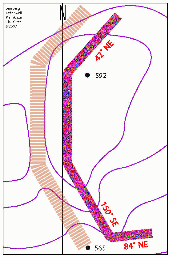 Der Jensberg trägt nicht nur die Knebelburg als Denkmal aus alten Zeiten. Genau eine halbe keltische Meile östlich nämlich wird der Berg durch einen mächtigen Keltenwall gegen Westen abgeschnitten (vgl. die Graphik). Die Reste des vierfach gewinkelten Walles sind noch heute gut erkennbar. – Der östliche Teil des Berges war folglich ein keltisches Oppidum.