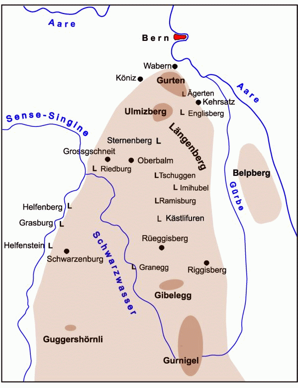 Flugbrunnen - Lutertal - Lutzeren - Laufenbad – Liebefels - Frienisberg – Frieswil – Säriswil – Illiswil - Belpberg - Ostermundigenberg – Großholz - Frumberg – Hünlihubel - Melchenbühl - Wittikofen - Mettlen - Dalmazi - Gurten - Ulmizberg - Neu Bubenberg – Längenberg – Gibelegg – Gurnigel – Guggershörnli – Köniz – Jensberg - Bellmund - Knebelburg – Lueg - Heiligenland - Zitistu - Friesenberg - Ferrenberg - Kappelen - Ochlenberg - Mättenberg - Bantiger - Luderfluh - Kehrsatz - Oberbalm - Grossgschneit - Borisried – Rüeggisberg - Trommwil - Mättiwil – Fultigen - Fultigenegg - Kästlifuren - Büfelhölzli - Wislisau - Rüschegg - Ägerten – Englisberg - Helfenberg – Helfenstein – Imihubel – Grasburg - Torenöli – Riedburg – Ramisburg – Sternenberg – Tschuggen – Granegg: Alle diese Berge, Orte und Burgen zeigen sich in der Geschichtsanalyse als bedeutungsträchtige Namen einer verschütteten religiösen Ordnung aus der Zeit vor der sicheren Geschichte.