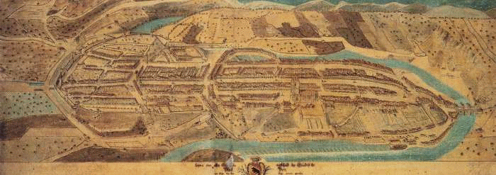 Historisierende Stadtansicht Berns von Johann Ludwig Aberli, datiert 1753