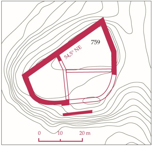 Die Orientierung der Längsmauer ist mit 54,5° Nordost zu bestimmen.