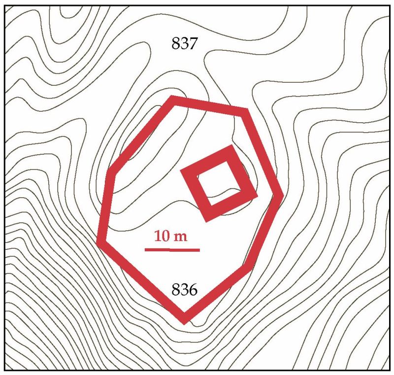 Des traces de murs d'une enceinte sont encore visibles sur les bords ouest de l'emplacement avec une pointe marquée vers le sud.