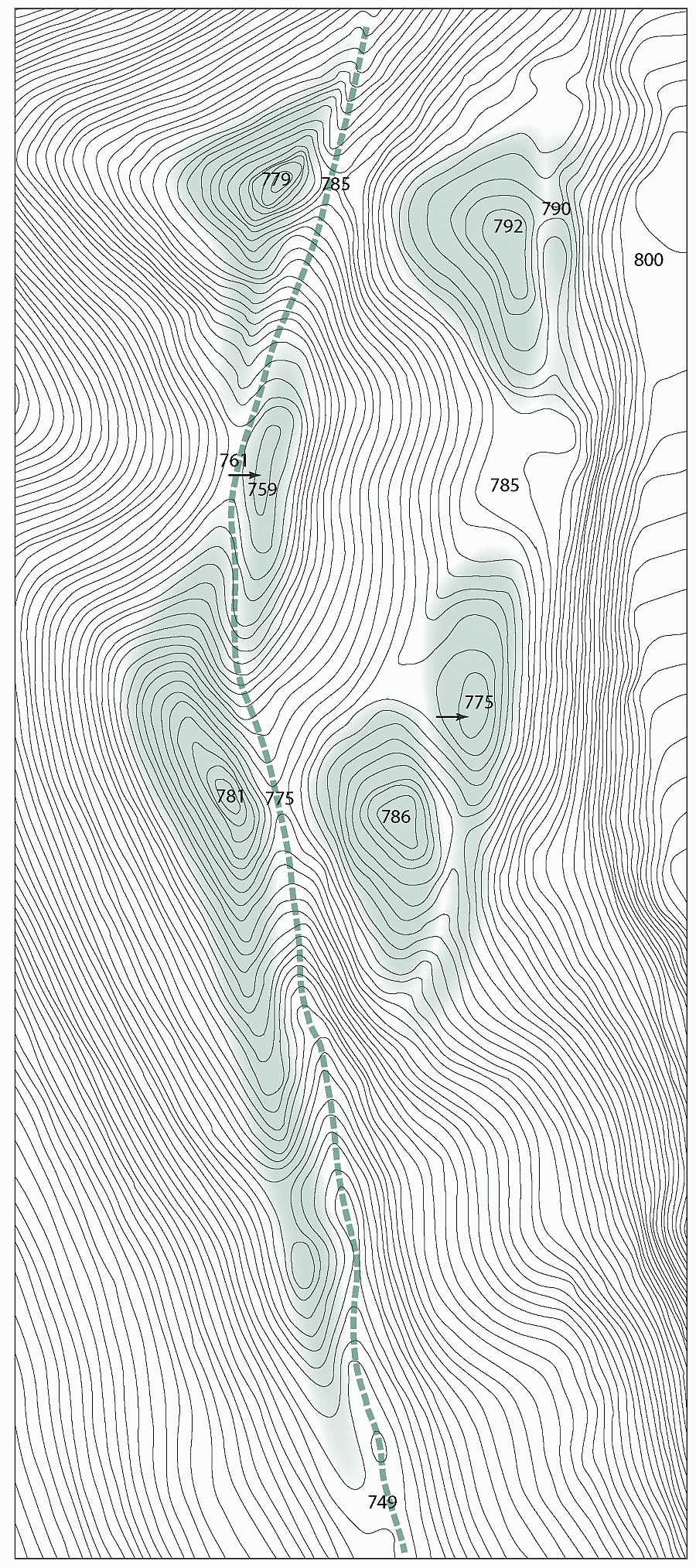 Das digitale Höhenbild LIDAR zeigt deutlich einen zweiten "Hohlweg". Dieser führte zwischen den beiden bergseitigen Gräben der "Burghügel" hindurch und durchquerte auch die grosse Senke.