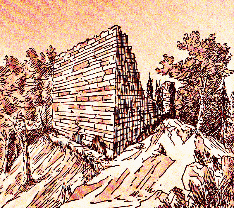 Von diesem Hauptturm ist die ganze Nordseite noch hochaufragend erhalten. Gegen Osten und Westen sind ebenfalls bedeutende Reste vorhanden.