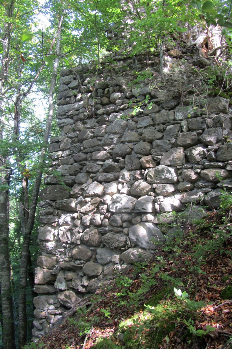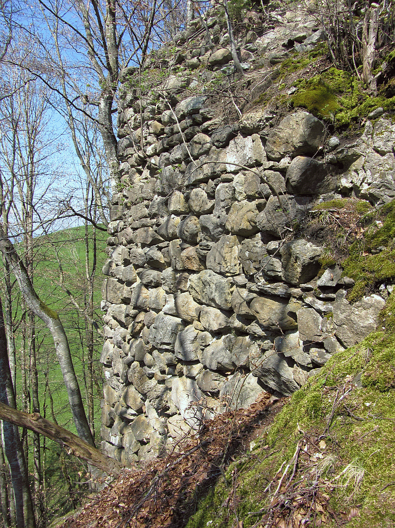Die steile östliche Schmalseite führt zu einem ersten Geländeabsatz, der Mauerspuren trägt. Es scheinen Reste eines Zwingers mit Torzugang zu sein.