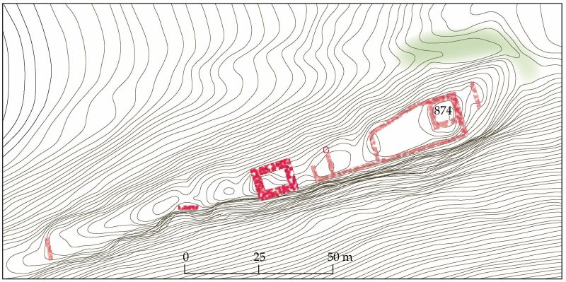 Dort finden sich bei Punkt 874 ausgeprägte Mauerspuren eines rechteckigen Turms. - Diese sind auch auf dem LIDAR-Bild deutlich zu erkennen.