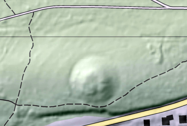 Die neue Methode des Laser-Scannings der Erdoberfläche DOM = digitales Oberflächenmodell oder LIDAR = light detection and ranging zeigt beim Grabhügel von Moncor, daß dieser ursprünglich von einem Graben umgeben war. - Von bloßem Auge sind davon nur noch schwache Spuren zu erkennen.