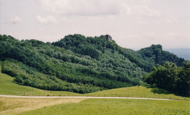 Die Mitte des bewaldeten Felsrückens verdeckt die Ruinen der weitläufigen Froburg. Der Felskopf rechts ist die Geißfluh.