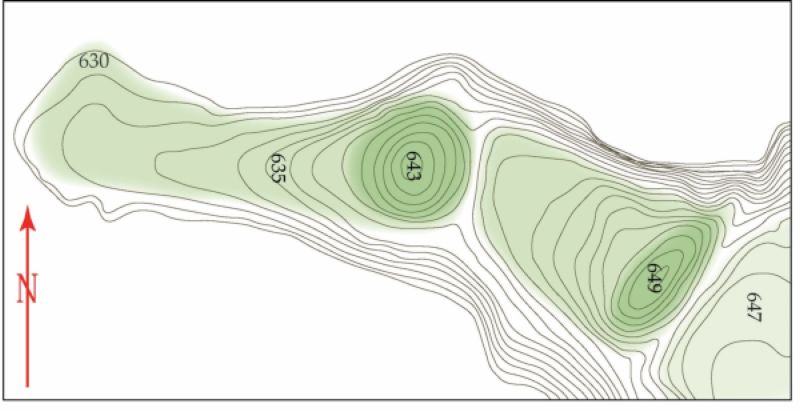 Und tatsächlich: Auf dem nördlichen Felskopf befindet sich eine alte Wehranlage mit einem Burghügel und ein paar Abschnittsgräben.