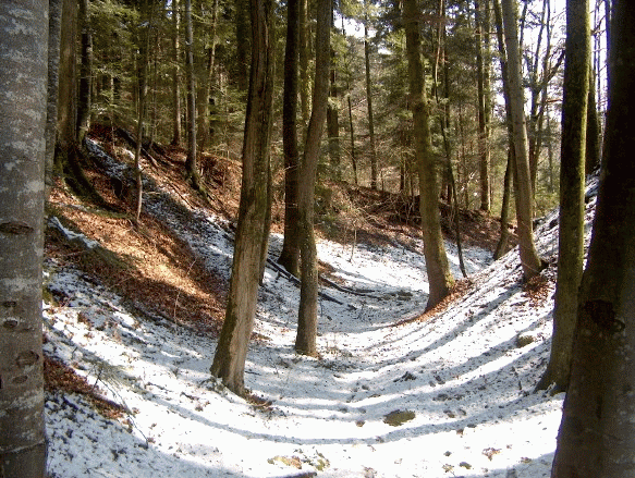 Der halbkreisförmig eingetiefte Halsgraben ist gut erhalten.