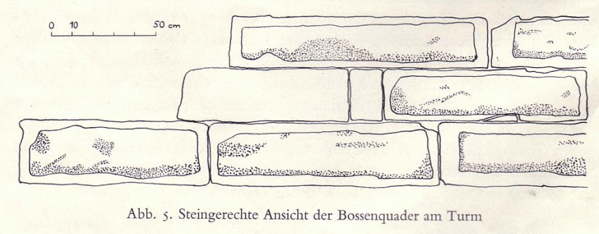 Zeichnerische Ansicht der Buckelquader der Mauerverkleidung des Turms der Riedburg