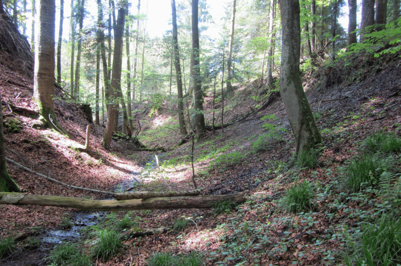 Die Burgruine Riedburg befindet sich rechts im Bild in der Mitte des Waldes, der steil zur Schwarzwasserschlucht abfällt.