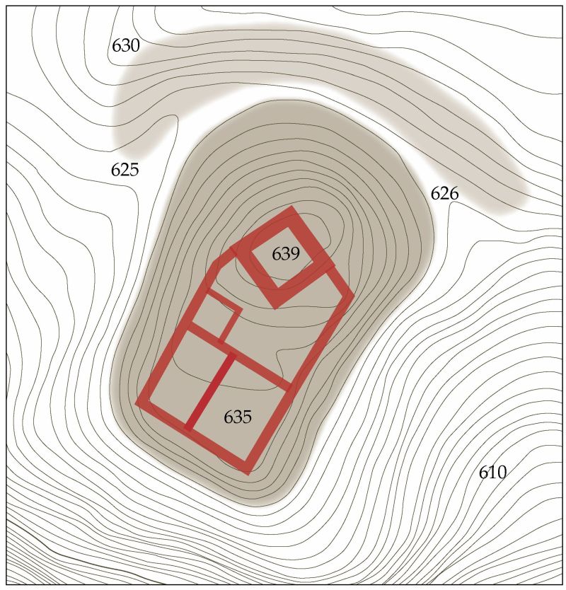 Der Burgplatz bildet ein längliches Rechteck, mit einer Erhebung gegen den Graben hin.