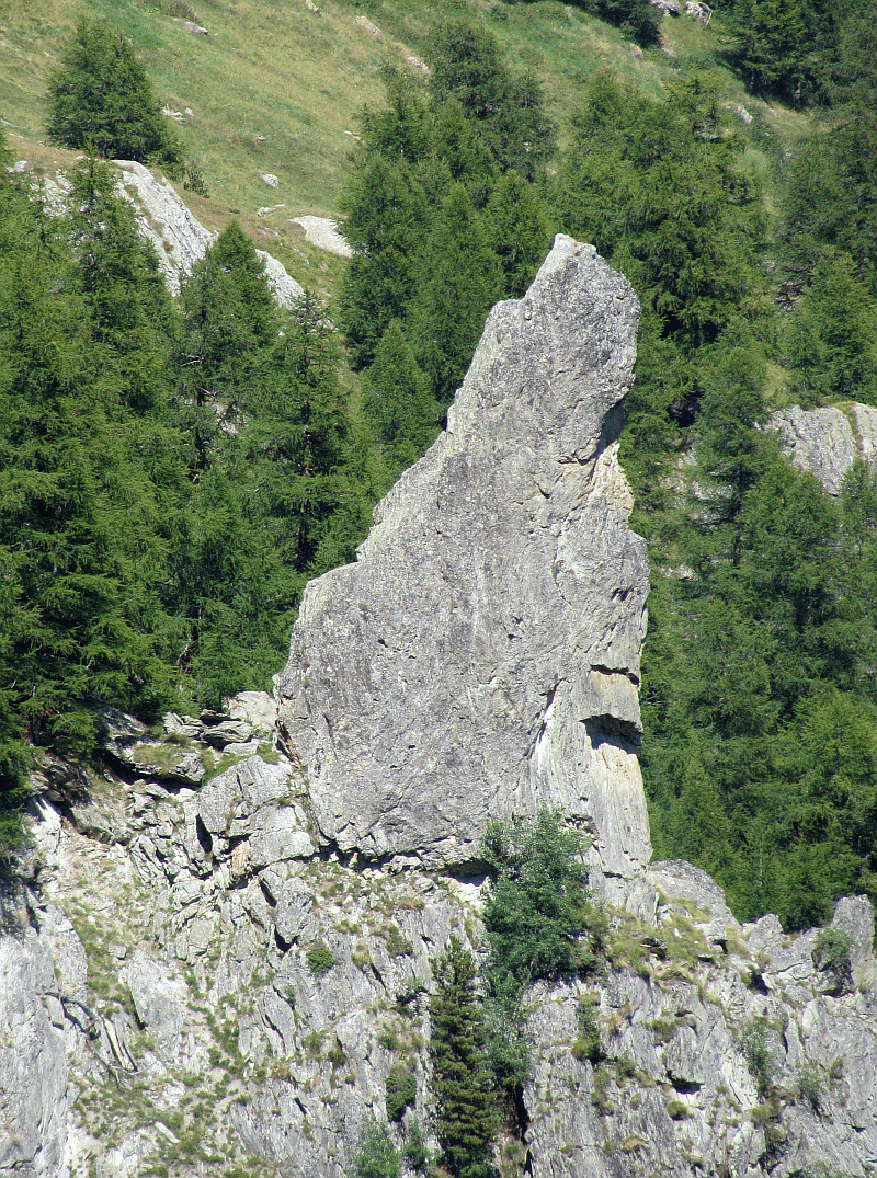 Von unten sieht der Felspfeiler aus wie ein leicht gekrümmter Finger. Von Süden aber - einer Breitseite - glaubt man ein Murmeltier darin zu erkennen. - Und aus der Nähe betrachtet gleicht der Kopf des Felspfeilers einer Schlange, einer Natter.