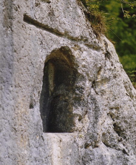 Die erwähnte Nische ist eckig in die Felswand gehauen, 30 cm tief, 70 cm breit und mit einer Höhe von 85 cm - wobei der Scheitel spitz zuläuft (vgl. das Foto).