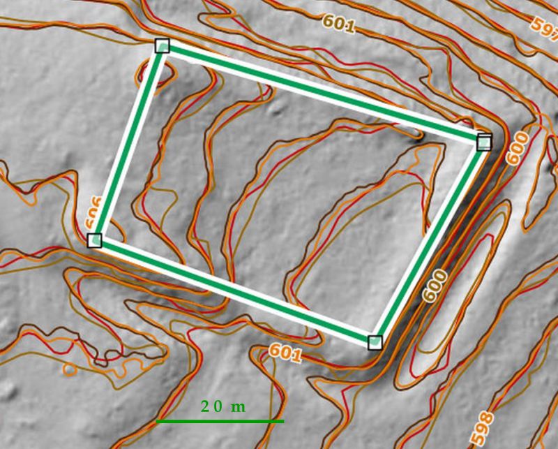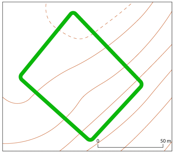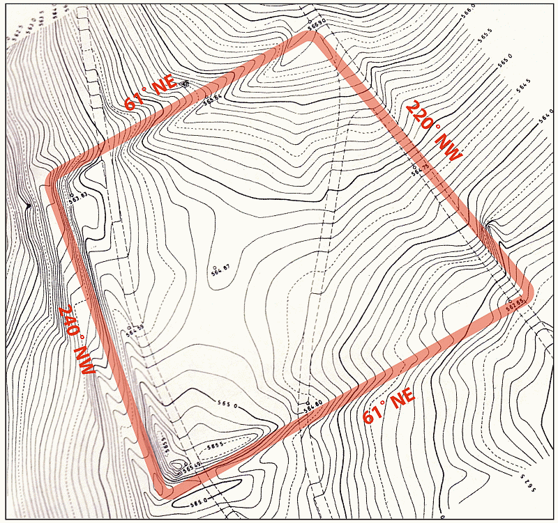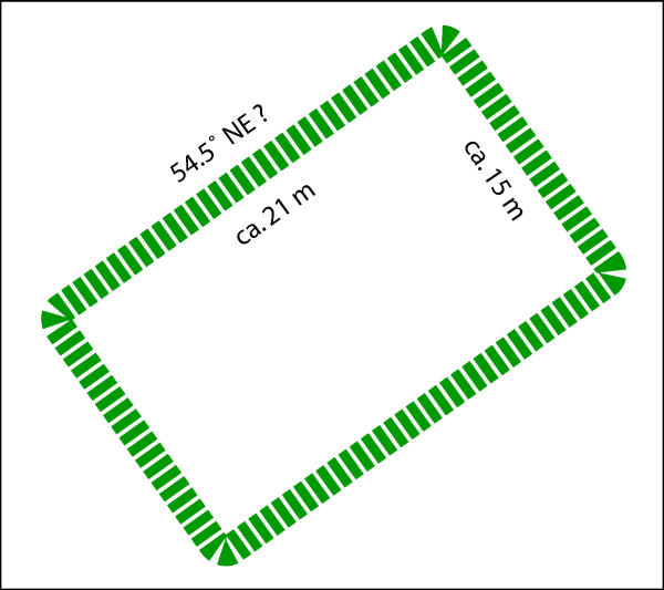 Die Viereckschanze bildete ein verzogenes Rechteck mit Seitenlängen von ungefähr 60, 75, 70 und 80 Metern. - Die beiden Schmalseiten scheinen Winkel von 36° NE (oben) und 42° NE (unten) gehabt zu haben.