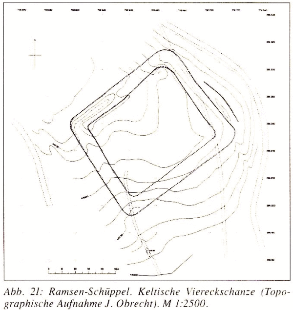 Weiter muß man sich vor allem auf den positivistischen Befund abstützen, also die allgemeine Charakterisierung der Schanzen. Diese waren – entgegen ihrem Namen – keine Wehranlagen. Deren Grundform war meistens viereckig, rechteckig oder verzogen rechteckig. Keltenschanzen waren von einem wenig hohen Wall umgeben, dem ein wenig tiefer Graben vorgelagert war. - Zudem besaßen solche Rechteckhöfe immer nur einen Torzugang, der meistens nach Osten oder Westen, aber nie gegen Norden ausgerichtet war.