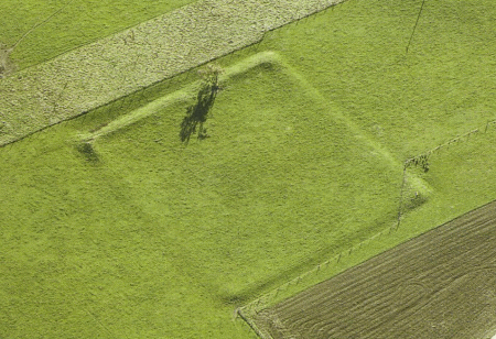 Diese Anlage in Süddeutschland ist ein schönes Beispiel für einen Rechteckhof, der sich auch in offenem Gelände noch gut abzeichnet. - Der Wall ist größtenteils eingeebnet. doch der Graben auf allen vier Seiten deutlich zu erkennen. - Man beachte auch die typischen Aufwölbungen an den Ecken.