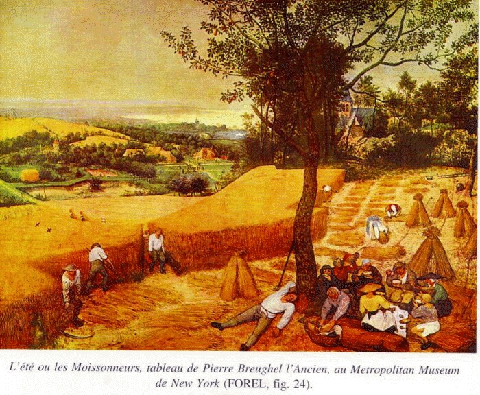 Ein bedeutendes kunstgeschichtliches Zitat muß ebenfalls noch erwähnt werden. Der bekannte flämische Maler Pieter Breughel („um 1525/30 – 1569") schuf im Rahmen seiner enigmatischen Gemälde auch eine sinnbildliche Darstellung einer Heuernte (vgl. die Abbildung).
